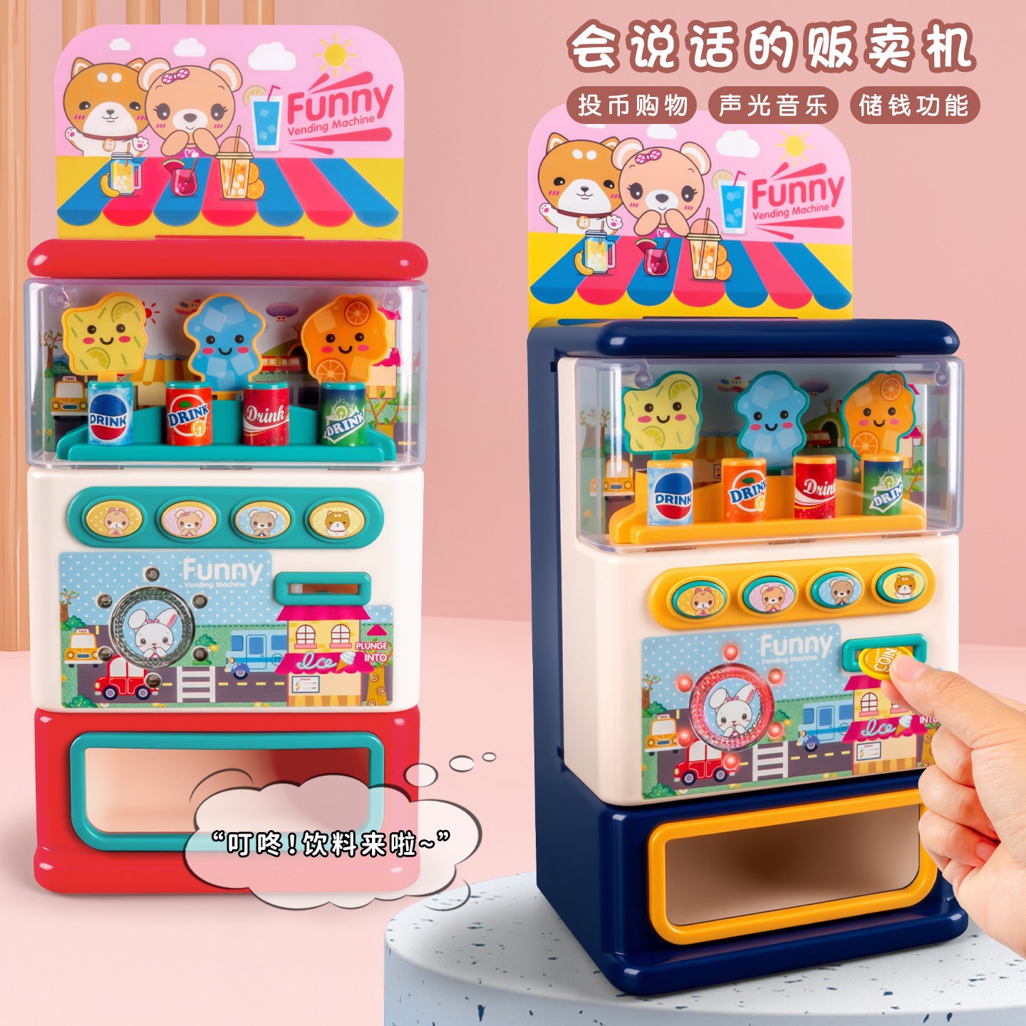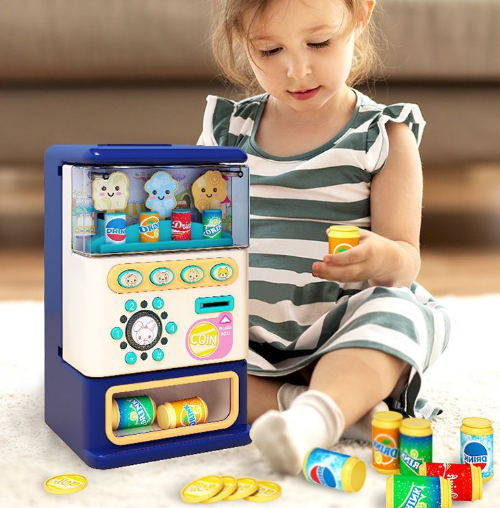 - Talking drink vending machine toy – insert the coins, press the buttons and enjoy fun phrases, lights and music.