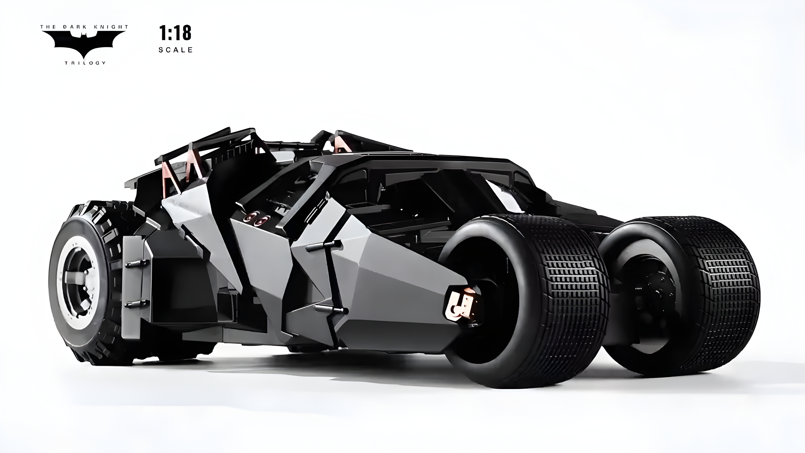 Realistic 1:18 scale Batmobile Tumbler with a detailed interior, functional steering wheel, and cockpit—every detail faithfully recreated.